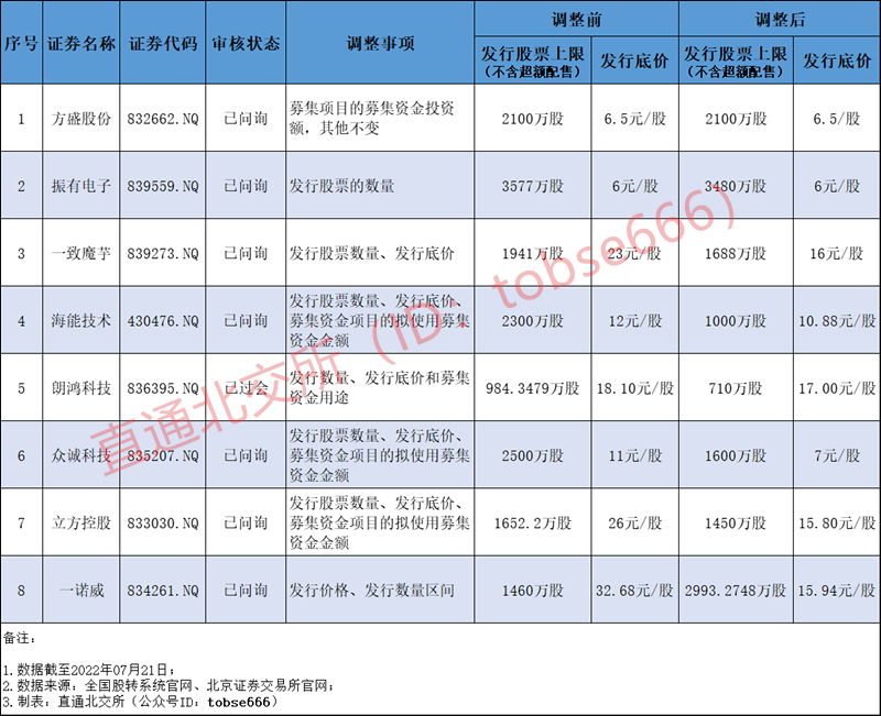 除此之外,众诚科技(835207.NQ)、朗鸿科技(836395.NQ)也在6月底宣布调整发行方案,同样涉及下调股票发行数量与发行底价。