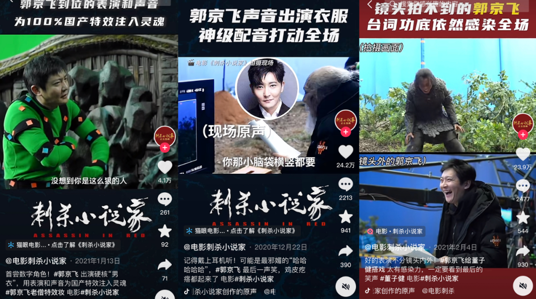 比如去年《刺杀小说家》筹拍阶段,片方就提前拍摄了郭京飞为“饰演”黑色盔甲提早到片场上妆、带AR设备捕捉CG动画、现场原声配音等勤恳工作的素材,后续这些素材被整合进“郭京飞特辑”的抖音二创视频里,帮助《刺杀小说家》官抖打了一场漂亮的前期宣发战。