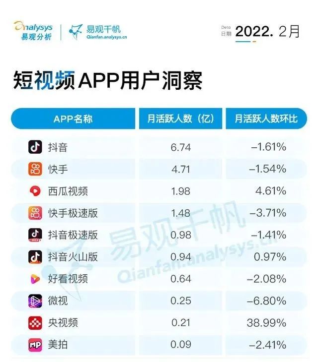 西瓜视频和抖音的差距大,是老百姓都知道的事儿,但西瓜绝对不算不温不火。西瓜视频的流量一直很大,以2022年2月为例,西瓜视频的月活数据排名第三,因为冬奥会的原因,活跃人数增加了4.61%,超过百度的好看视频。西瓜视频是一个知名度虽然不高,但是流量却很大的平台。