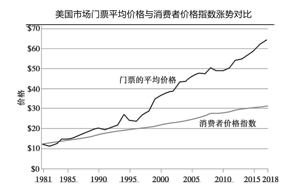 以美国的音乐市场为例。从1996年到2018年,现场演出的平均票价上涨了190%;而同期整体消费价格的涨幅只有59%。更为直观地说,1981年演出门票的平均价格为12美元,倘若门票价格只随通货膨胀增长,那么2018年演出门票的平均价格应为32美元,可现实是2018年门票的平均价格已经上涨到了70美元。