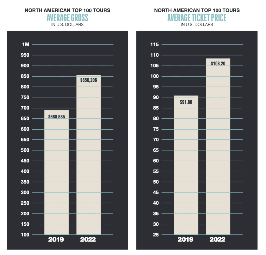 同时,统计结果还向我们揭露了一个事实,即上涨的票价并没有扼杀粉丝们的热情。疫情当前,观众们对于现场演出有强劲的需求。今年上半年,票房前100位的巡演平均售出7913张门票,相较于2019年的平均票数7496张,提高了5.6%。