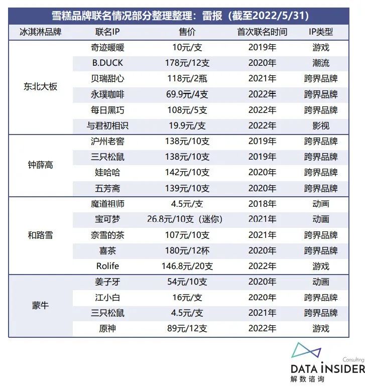而且,品牌们为了布局年轻化消费市场,自2018年起雪糕跨界联名成为了吸引年轻人的“法宝”。据雷报统计的32款IP联名雪糕中,跨界品牌联名达16款,而此类联名让雪糕价格一骑绝尘——雪糕绝大部分折合单价都在10元以上。