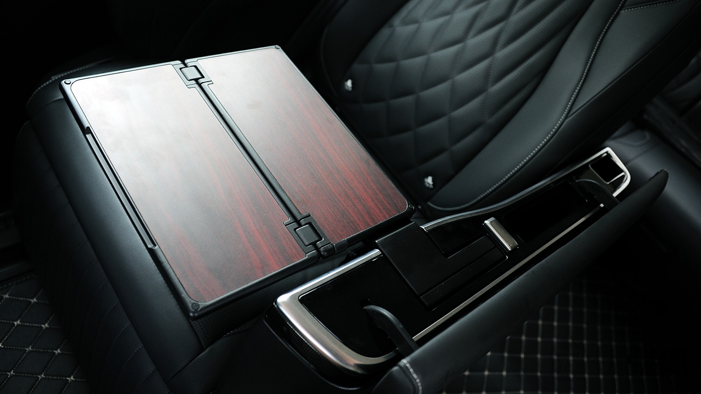 在第二排座椅的另一侧为翻盖,里面有隐藏式小桌板,并且每一个座椅都配备了USB和type-C接口,对于办公来说是非常贴心了。同时,每个座椅还配备了独立杯架、手机槽,基本上日常最重要的一些需求,上汽大通MAXUS G90都可以满足。