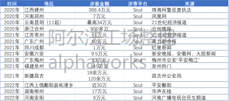 Soul所涉“杀猪盘”案件,来源:各媒体报道,阿尔法工场整理