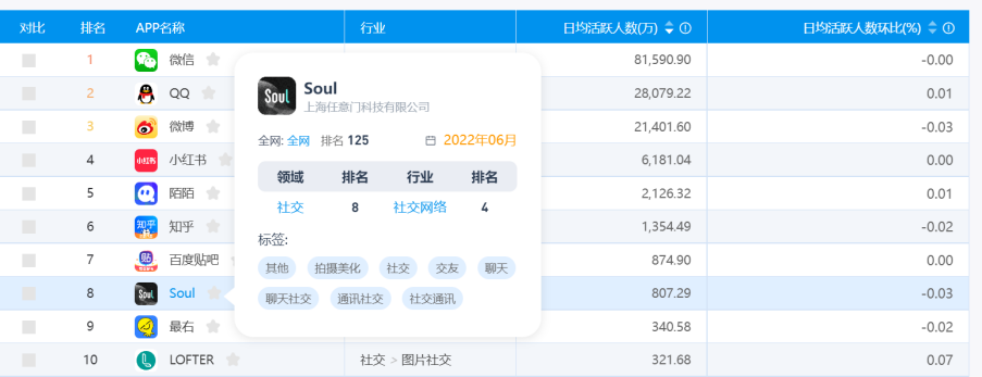按日活及月活人数排名,Soul是国内排名靠前的社交网络平台。