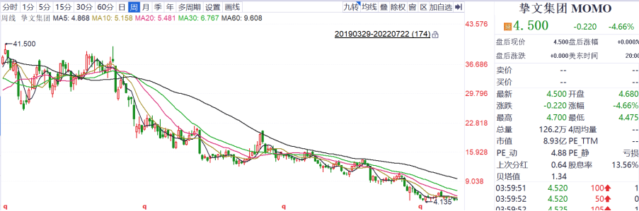 挚文集团的市值也曾有过百亿美元的巅峰期,但陌生人社交赛道高光期过后,据7月22日收盘价,其市值已经跌到8.93亿美元。