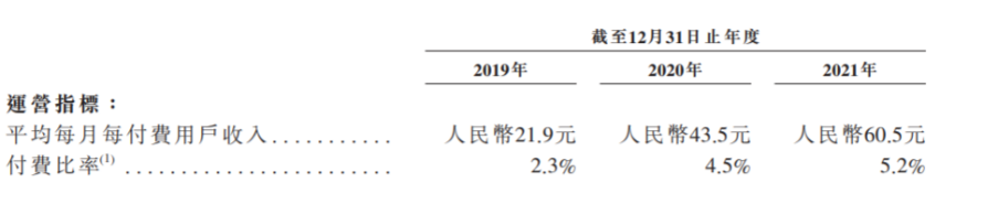 2019年-2021年,Soul的平均每月每个付费用户的收入仅为人民币21.9元、43.5元及60.5元。