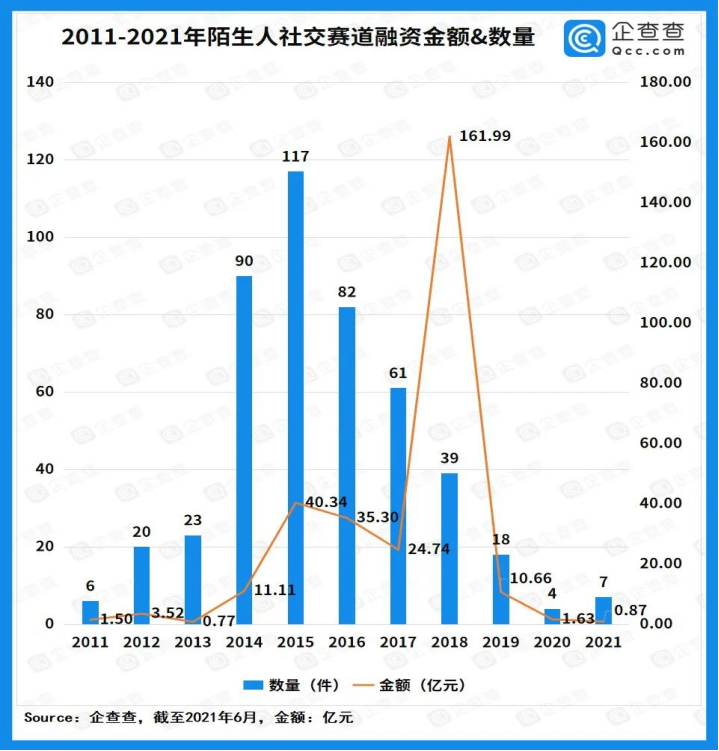 但高光过后,行业融资规模已呈现大幅下滑趋势。资本热度消失的非常快:2021年全年,陌生人社交赛道仅发生7起融资,融资金额合计只有0.87亿元,基本被投资人抛弃了。