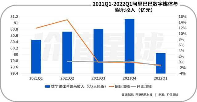 根据阿里巴巴财报,2021年第一季度到2022年第一季度(自然年),阿里巴巴数字媒体与娱乐板块的收入分别为80.47亿元、80.73亿元、80.81亿元、81.13亿元和80.05亿元。环比几乎没有增幅,且在2022年第一季度反而有环比1.33%的降幅。