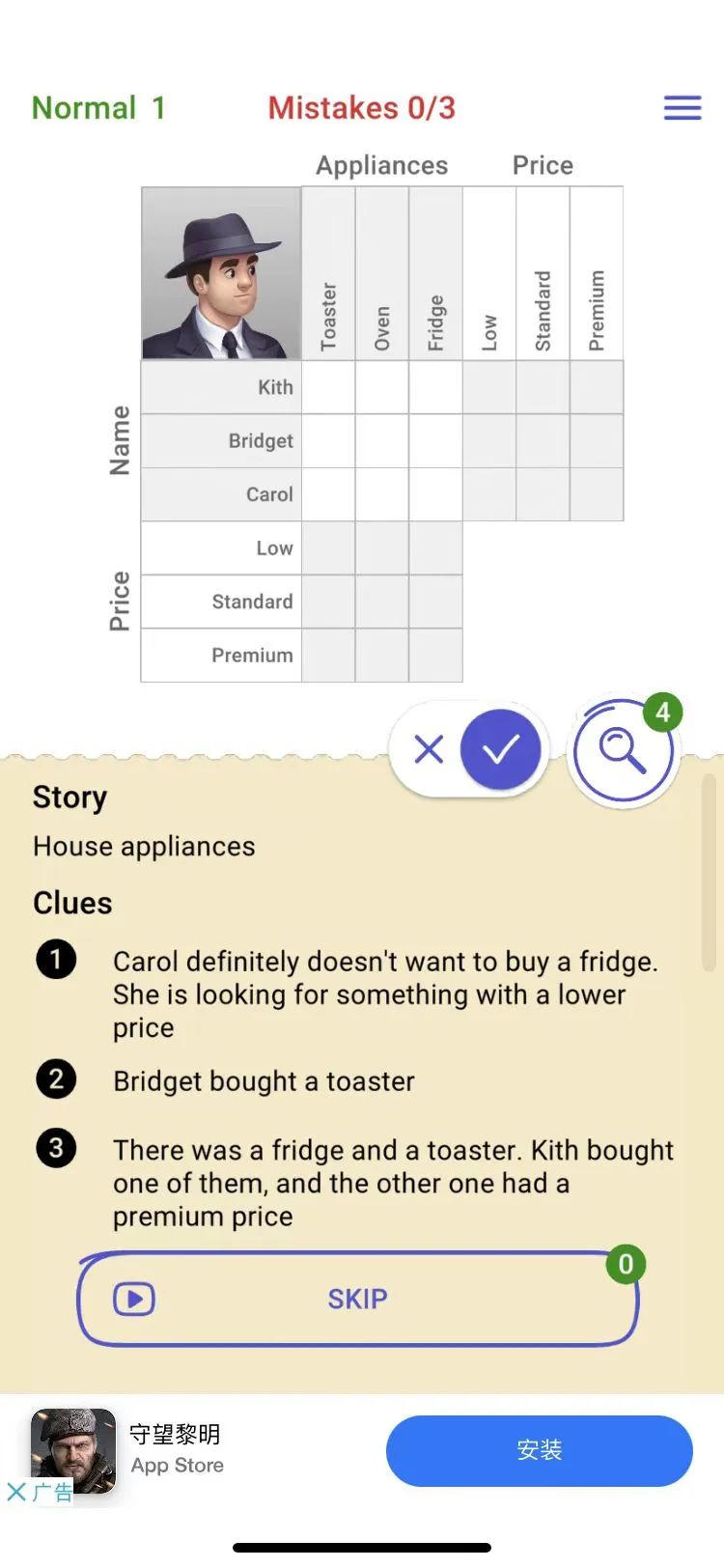 从形式上看,「Cross Logic」的创新主要在于它引入了一种历史悠久、但在手游市场中相对罕见的解谜机制——思维逻辑网(Logic Grid)。所谓逻辑网就是用多个备选条件按类似直角坐标系排列组成的网格,玩家需要通过几条简单的线索,在网格中打钩和打叉,最终将所有条件一一正确对应,完成解谜。