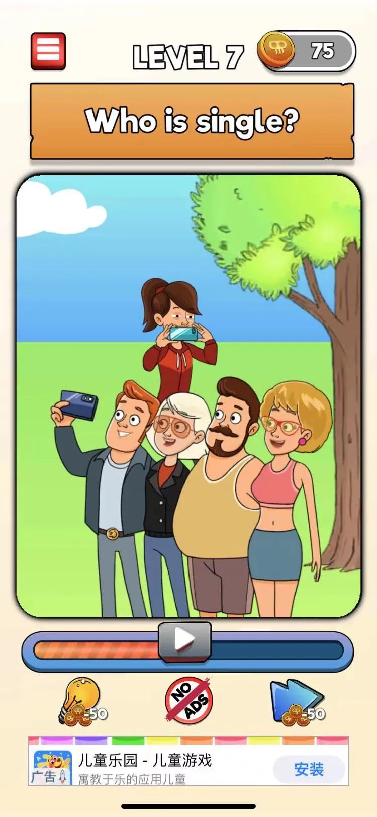 简单的游戏设计,对应的也只有一种简单的内部货币“Coins”,这款印有卡通骷髅头像的货币通常可以在过关后取得,其最大意义在于帮助玩家购买提示和快进次数。提示可以标出谜题的关键线索,快进则可以让玩家直接跳过一道迷题,继续游戏进程。
