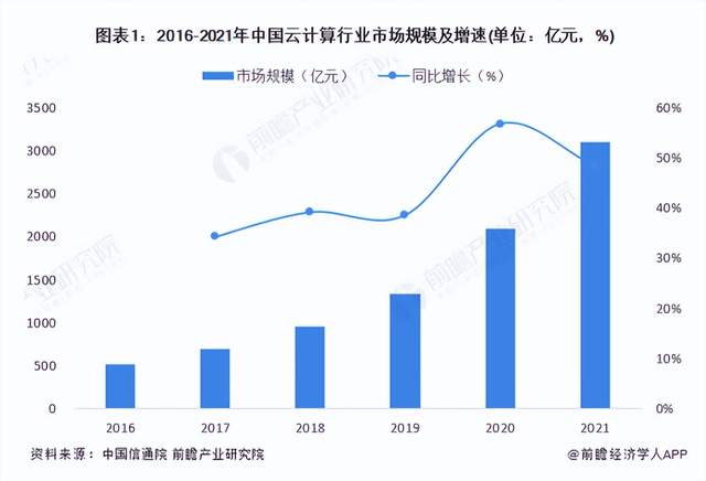 在我国,云计算市场从最初的十几亿增长至目前的千亿规模,行业发展迅速。据中国信息通信研究院披露的数据显示,2017-2019年期间,我国云计算行业的市场规模增速均在30%以上,呈高速增长态势。2020年,我国经济稳步回升,云计算市场呈爆发式增长,云计算整体市场规模达2091亿元,增速56.7%。2021年中国云计算市场规模达到3102亿元,增速48.4%。