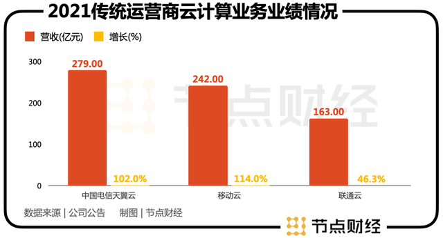 而从市场份额角度看,互联网巨头想要挑战的云计算市场,正在被电信、移动、联通等传统运营商所瓜分。2021年财报数据显示,中国电信天翼云、移动云、联通云营收分别达到279亿元、242亿元、163亿元,分别同比大增102%、114%、46.3%。