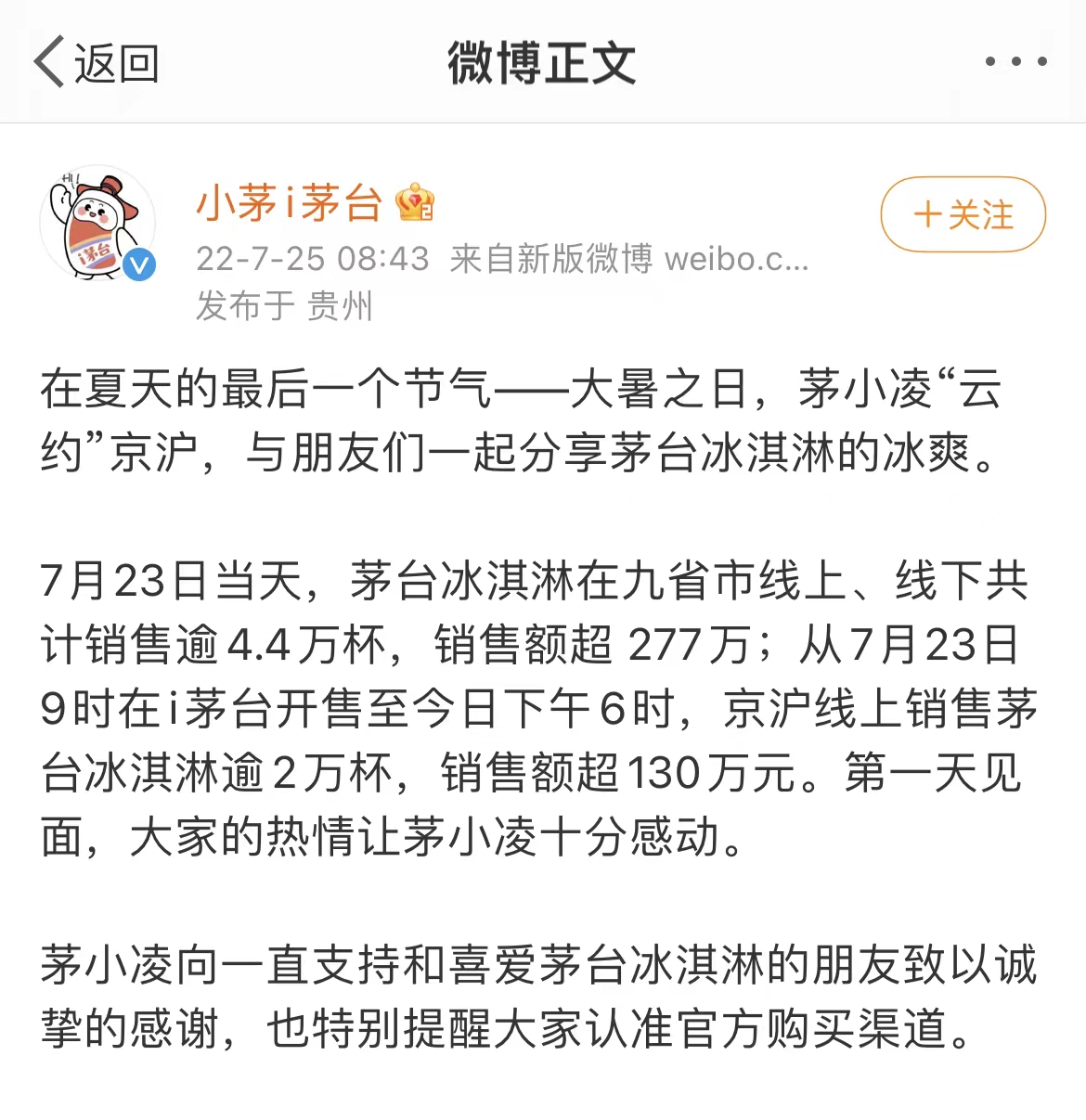 7月23日,贵州茅台推出的“i茅台”App首次向京沪开通茅台冰淇淋线上销售。“i茅台”App发布的信息显示,从7月23日早上9时开始,北京、上海的消费者登录“i茅台”App,进入“云购”页面点击链接即可购买茅台冰淇淋,顺丰冷链送达,主城区部分区域还可实现3小时“及时达”。