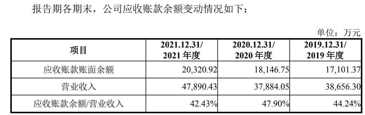 尽管沃文特业绩忽上忽下,但应收账款却持续走高。2019年-2021年,公司应收账款余额分别为1.71亿元、1.81亿元和2.03亿元,占营业收入的比重分别为44.24%、47.90%和42.43%。
