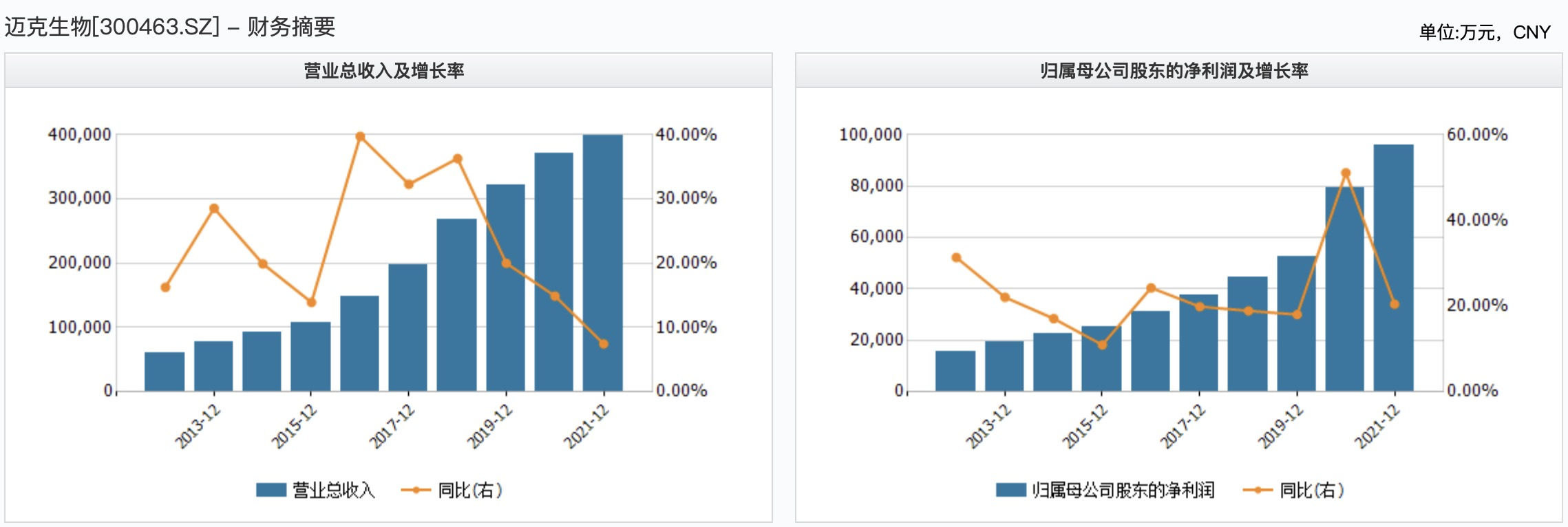 反观迈克生物,其自上市以来业绩逐年递增,2019年-2021年,分别实现营收32.23亿元、37.04亿元、39.81亿元,同比增长20.02%、14.92%、7.47%;净利润5.66亿元、8.21亿元、10.02亿元,同比增长17.14%、45.20%和22.02%。