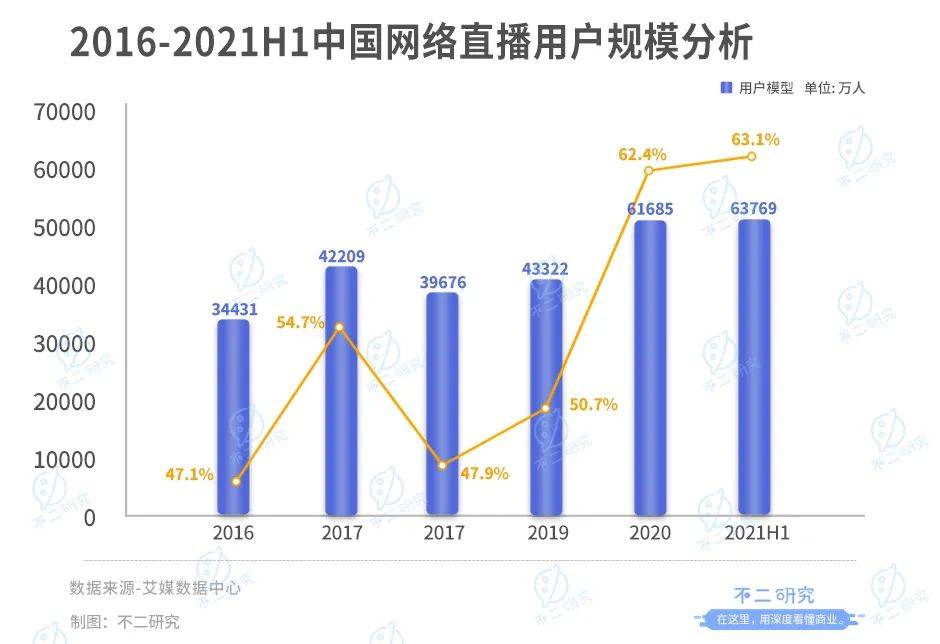 艾媒数据显示,截至2021年6月,我国网络直播用户规模达6.38亿,与2020年同期相比增长47.2%,占网民整体的63.1%。
