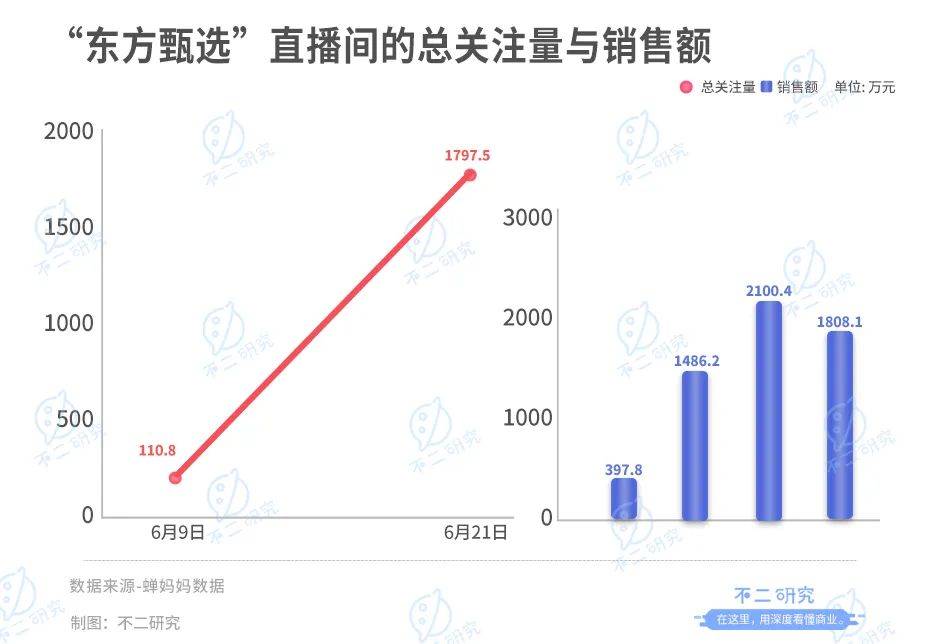 东方甄选直播间的销售额从397.8万攀升到1486.2万、2100.4万及1808.1万,同比暴增数十倍。