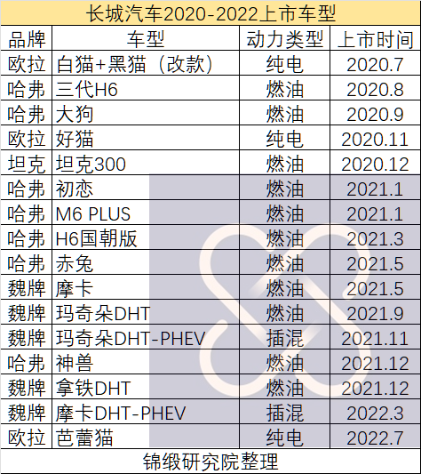 在2020-2022年间,长城汽车不仅没有提前规划新能源汽车的C端布局,而且在C端放量之后一年多的时间里,也仍未正式布局新能源车中高端产品线。在2020-2022年间,长城总共上市16款车型,只有5款算新能源产品,能上绿牌,而其中纯电车只有3款。总体产品布局还是在吃哈弗的“老本”,放养魏牌的高端,靠了无划时代感的新能源车在新牌桌周围混脸熟。