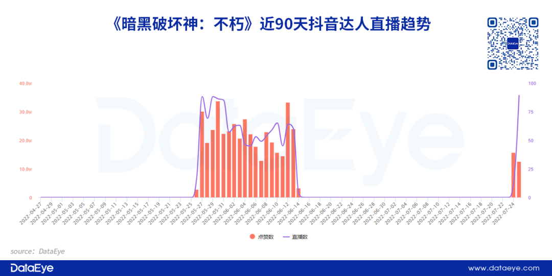 另一方面,DataEye研究院观察到,自6月15日起,《暗黑破坏神:不朽》便不再开启抖音效果直播,直到7月24日游戏正式上线前一天,《暗黑破坏神:不朽》再度开启直播,并且直播量、点赞量均呈现上升趋势。