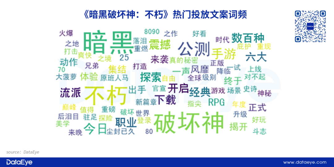 根据DataEye-ADX投放数据,《暗黑破坏神:不朽》近30天热门投放文案重点突出“暗黑”、“破坏神”、“正版”等词,主要是为突出产品名IP名。
