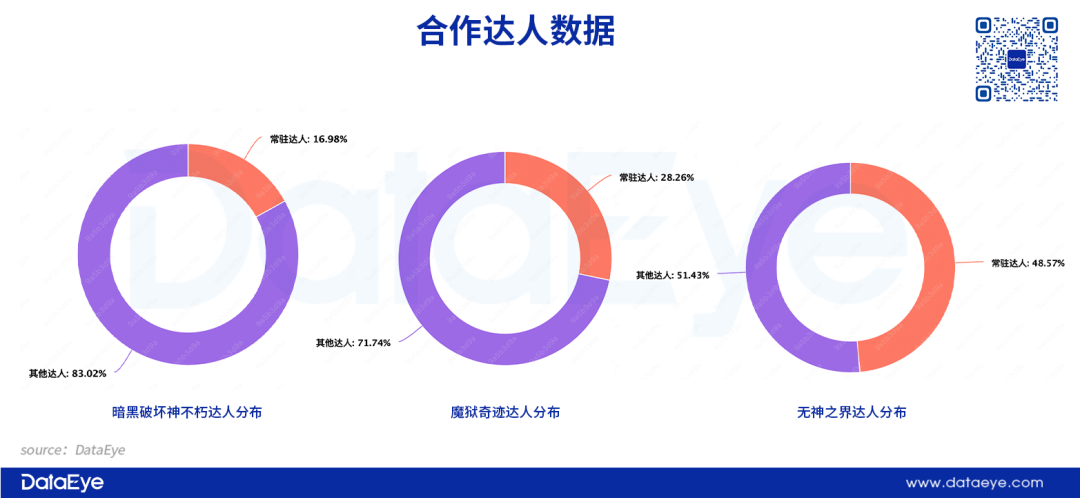 从达人分布来看:《暗黑破坏神:不朽》常驻达人比例约为17%相对较少,或许是暂未大规模启用达人;《无神之界》常驻达人比例约为48%,其他达人占比约为52%;《魔狱奇迹》常驻达人比例约为28%,其他达人占比约为72%;