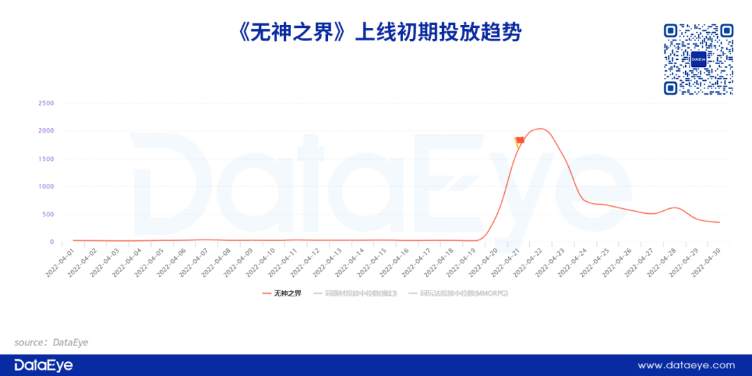 事实上,国内MMORPG产品在上线首日投放节奏多以“集中爆发”式投放,或许因为此前大多魔幻MMO始终在国内没能打开太大局面,上线爆发阶段的集中投放唤起注意,更利于产品后续营销。根据DataEye-ADX投放数据显示,今年4月份上线的《无神之界》在预热阶段同样以极小量进行投放,上线当天加大投放量,之后又大幅减少。
