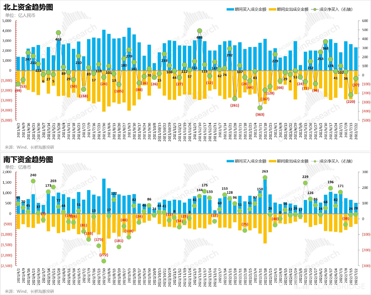 在 A、港股资金流向上,随着加息预期的企稳,北上资金流出速度明显放缓,而南下资金则是继续缓慢净流入,只是财报季来临之际,整体交易量收缩了很多。