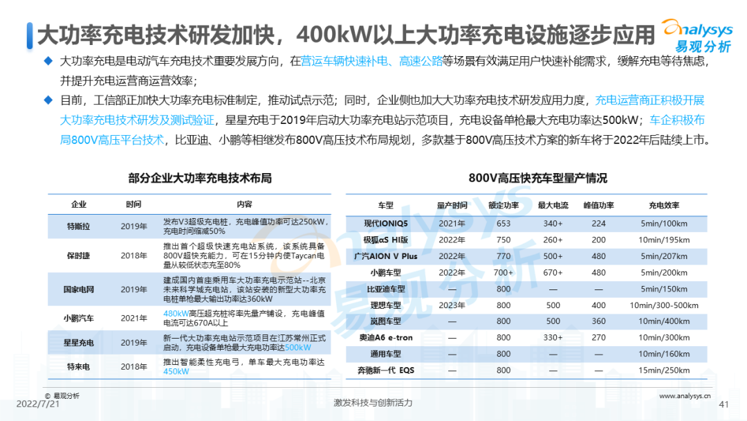 - 大功率充电技术研发加快,400kW以上大功率充电设施逐步应用;