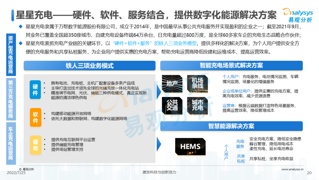 - 以特来电、星星充电等为代表的资产型充电运营商,专注于自有充电相关资产运营。其中,特来电作为特锐德控股子公司,成立于2014年,是中国最早从事充电服务的企业之一。截至2022年6月,其业务已覆盖全国350座城市、拥有超26万台充电设施运营终端,自成立以来累计充电量超132亿度,碳减排1352万吨以上;