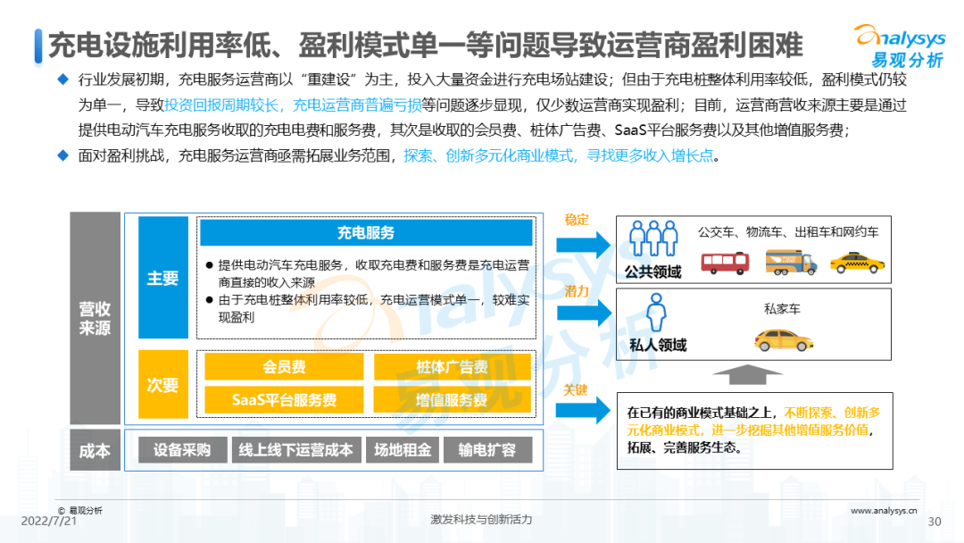 - 充电设施利用率低、盈利模式单一等问题导致运营商盈利困难;