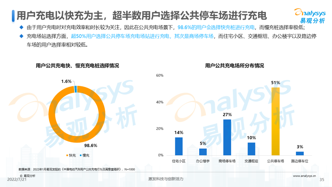 - 用户充电以快充为主,超半数用户选择公共停车场进行充电;