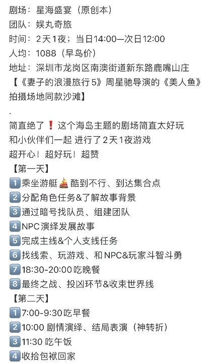 也有不少地方推出了定制版户外剧本杀剧场,如深圳某剧本杀机构推出2天1夜的沉浸式原创剧场《星海盛宴》,安排在电影《美人鱼》《妻子的浪漫旅行5》取景地——深圳龙岗区南澳的鹿嘴山庄附近,而从登岛的那一刻起,剧场就已经开启,每位玩家按角色领取任务,在快艇出海、乘风破浪中破案解谜,通过原创剧本的个性化打造,把户外场景和剧本杀实现更和谐、深度的融合。