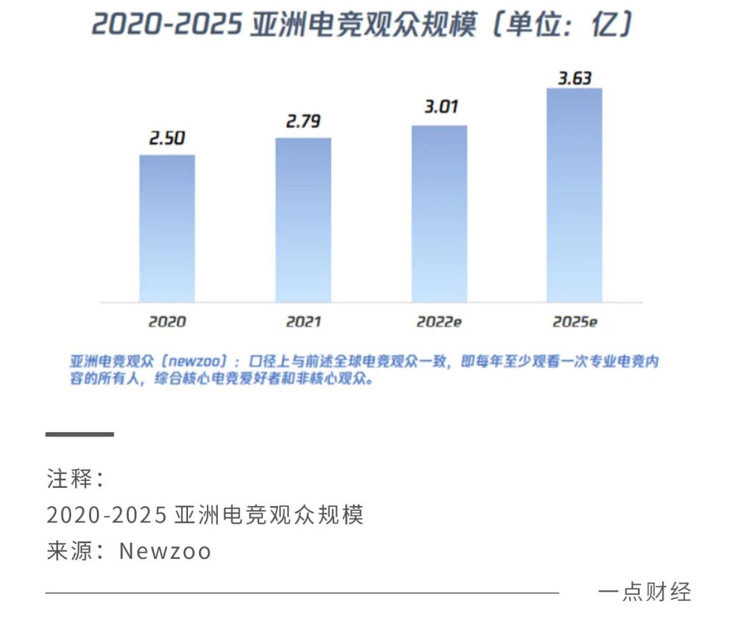在人群覆盖上,根据Newzoo最新数据,2022年亚洲电竞观众将增至3.01亿,年度增长率为8.0%,到2025年将增长到3.63亿。
