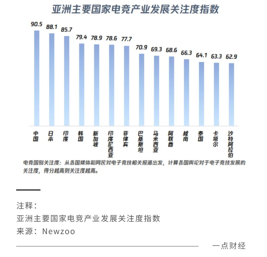 在增长的亚洲电竞产业中,中国电竞产业关注度得分90.5,居亚洲国家首位。