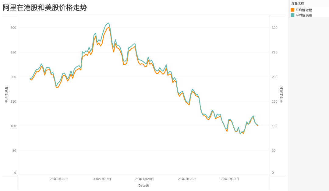 在上述理论之下,我们再看阿里的表现。2019年在香港二次上市对普通股进行“一拆八”,考虑到港币与美元的汇率也在1:8上下浮动,也就是如果市场均衡(无套利空间),以美元计价的阿里纽交所股价应该与以港币计价的港交所股价相当,那么事实呢?