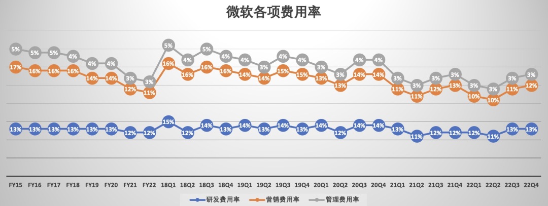 总体来说,微软各项费用率基本保持稳定,在费用方面的支出都有保持了有效的控制。
