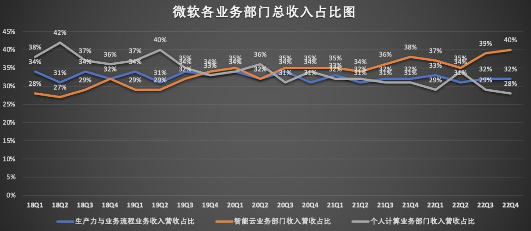 由上图可以看出,微软的营收多元化做得还是不错的,三大主要业务部门贡献的营收基本各自贡献了三分之一的收入,智能云业务贡献的收入占比相对更高一些,成为当前微软发展中最为核心的增长引擎。