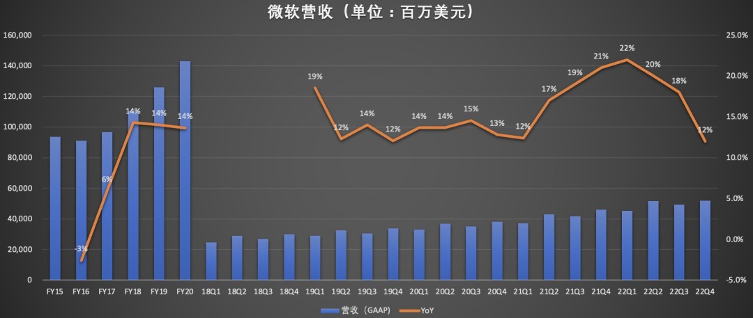 从上图可以看出,自2021财年Q2开始至2022财年Q3,微软季度营收同比增速保持在17%~22%之间。本季度,季度营收同比增速放缓至12%,这一增速与2019财年Q4的增速持平,处于历史低位。