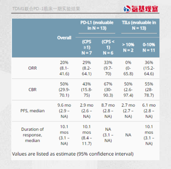 在接受T-DM1联合K药的治疗后,在PD-L1表达<1的亚组中患者客观缓解率达到29%,中位无进展生存期为 2.9个月,而PD-L1表达≥1的患者,客观缓解率则达到了33%,中位无进展生存期为8.7个月。