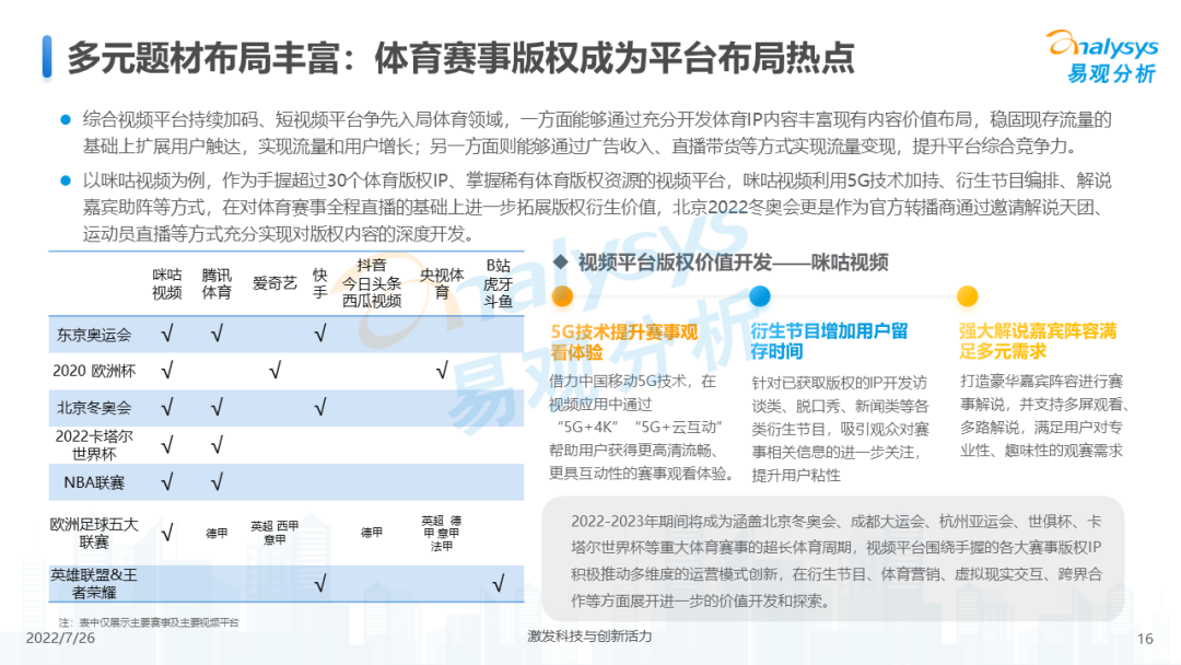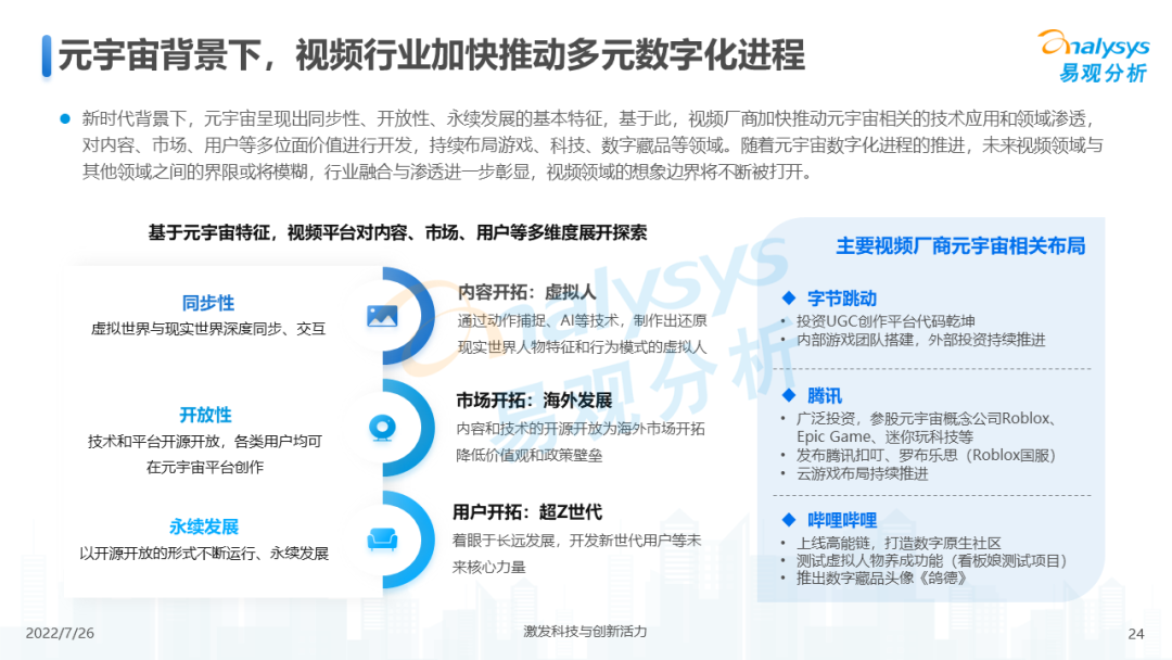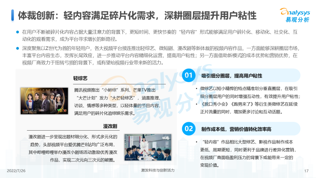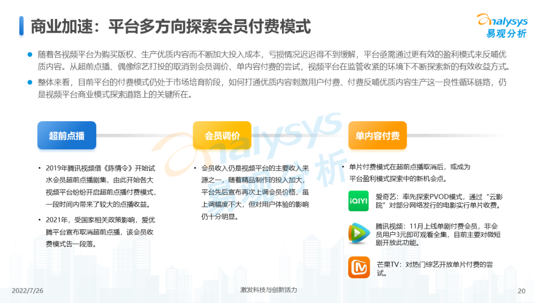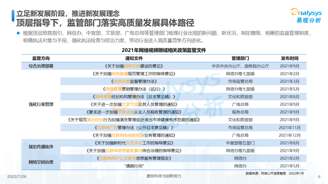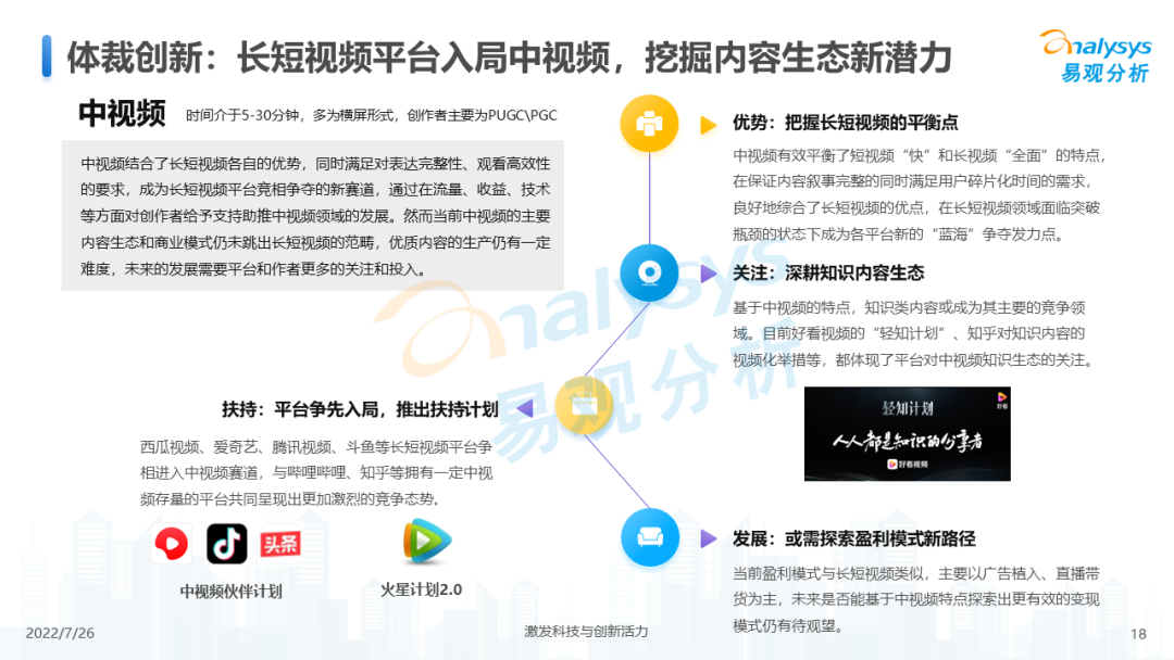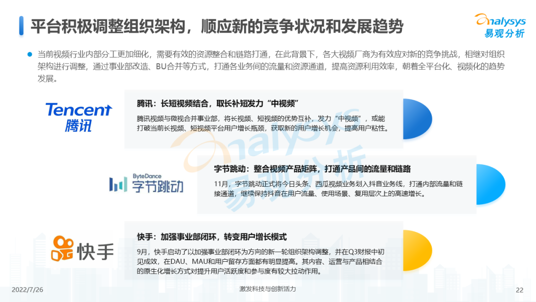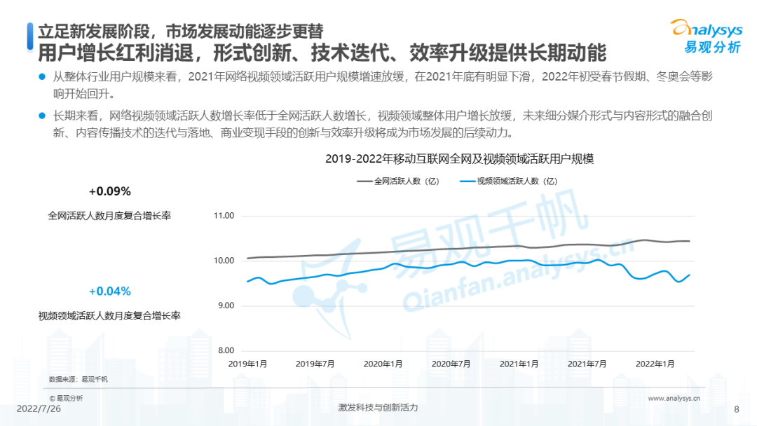 从整体行业用户规模来看,2021年网络视频领域活跃用户规模增速放缓,在2021年底有明显下滑,2022年初受春节假期、冬奥会等影响开始回升。长期来看,网络视频领域活跃人数增长率低于全网活跃人数增长,视频领域整体用户增长放缓,未来细分媒介形式与内容形式的融合创新、内容传播技术的迭代与落地、商业变现手段的创新与效率升级将成为市场发展的后续动力。