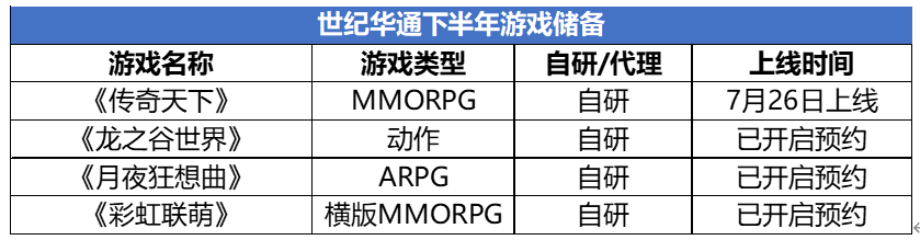 产品储备方面,下半年,世纪华通预计将推出4款游戏(《传奇天下》已于7月26日上线),目前4款游戏均已获得版号。