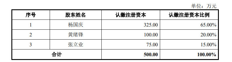 2016年5月,杨国庆、黄绪锋、张立业签署《青岛沃隆食品有限公司章程》,约定公司注册资本为 500万元,杨国庆、黄绪锋、张立业分别认缴出资 325万、100万、75万。