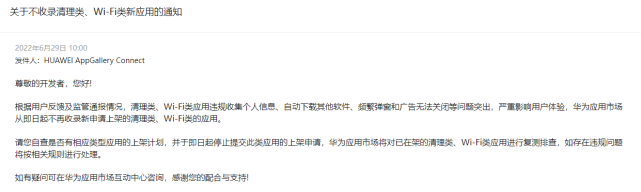 6月29日,华为应用市场发布通告称,不再收录新申请上架的清理类、Wi-Fi类应用,并对已在架的清理类、WiFi类应用进行复测排查,原因是这类应用存在违规收集个人信息、自动下载其他软件、频繁弹窗和广告无法关闭等问题。