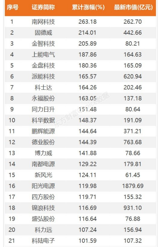 进入7月份以来,储能板块指数更是扶摇直上,多只个股连续涨停,单单比较涨了“10cm”还是“20cm”已经不够刺激,而是你涨停了几次。从4月27日算起,储能板块中有超过20只个股股价翻倍,南网科技、固德威和金智科技等累计涨幅甚至超过200%。