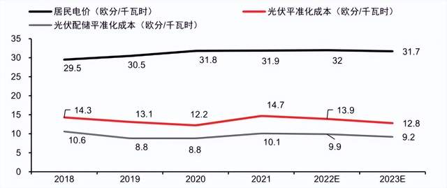 图6:德国居民电价、光伏及光伏配储平准化成本对比,资料来源:EUPD(含预测),中信证券