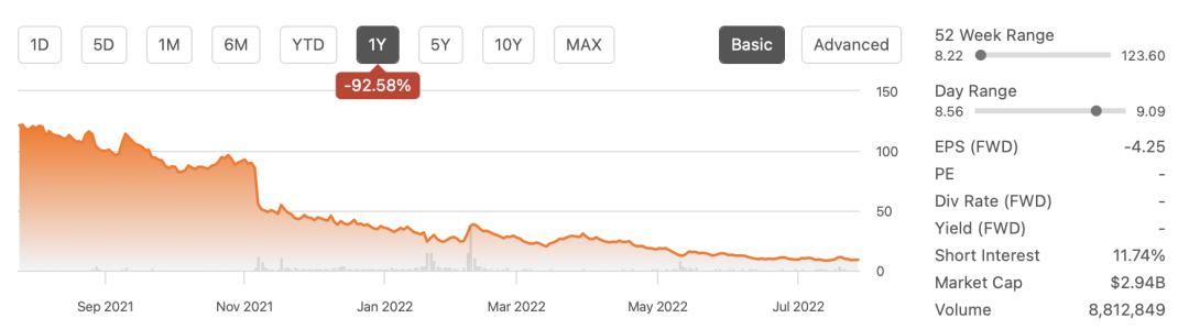 过去一年Peloton的股价走势