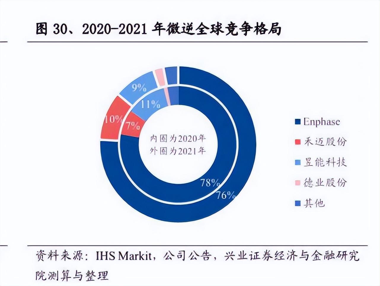 兴业证券数据显示,在全球微逆变器市场里,Enphase 2020、2021年的市占率分别在78%、76%,禾迈股份、昱能科技所占份额较少。