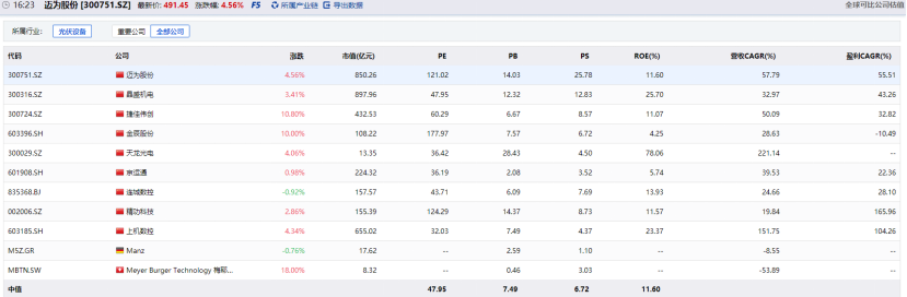 从整个光伏产业链来看,设备端的PE都相对偏高。资料显示,A股光伏设备市盈率中值为47.95。