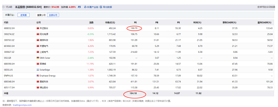 而根据同花顺iFind的数据来看,逆变器行业PE(TTM)中值,达到154.10倍,禾迈股份则高达190.79倍。
